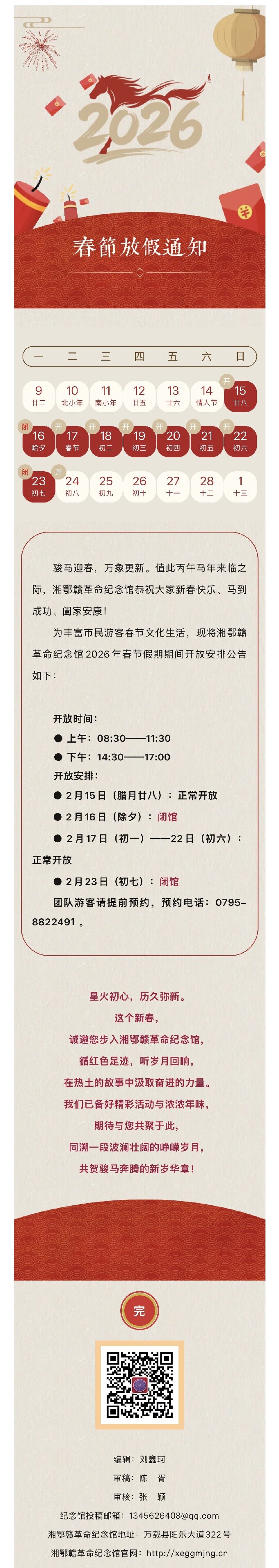2026年湘鄂赣革命纪念馆新春开放时间公告